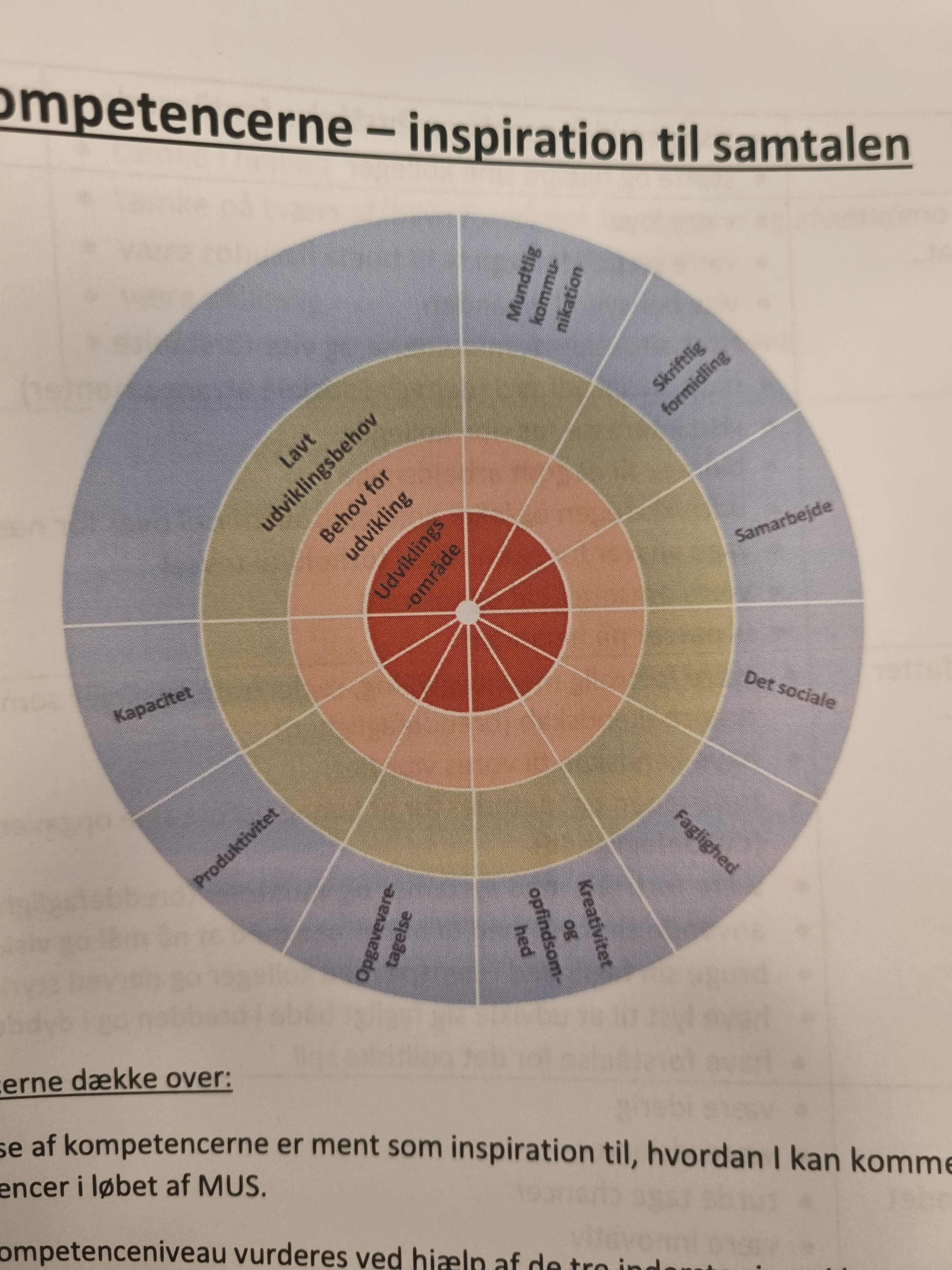 MUS와 mini-MUS, 임금협상*은 하나의 사슬처럼 얽혀서 굴러간다. 연초에 MUS를 하고나면, 반년뒤에 mini-mus가 있고 오래지 않아 그 뒤로 연봉 협상이 따른다. (*민간에서도 비슷하게 굴러간다하지만, 나는 덴마크에서 민간 경험은 없으므로 중앙부처에 해당하는 Staten만 보자면 우리 사무관급에 해당하는 Fuldmægtig는 거의 개별 협상을 하지 않는다. 수당 정도만 협상하고 나머지는 자신이 속한 노조가 협상한 결과를 그냥 받아들인다. 자신이 특별하게 더 잘 받을 수 있다고 생각되는 경우라면 개별 협상을 물론 할 수 있고, 그렇게 하는 사람도 있다. 난 딱히 내가 더 특별하게 잘 받을 수 있다고 생각되지 않기 때문에 그렇게 하지 않는다.) MUS는 Kompetencehjul이라는 툴을 통해 개인 역량 계발을 돕고자 하도록 하는데, 우리 조직같은 경우 구술커뮤니케이션, 서술방식 소통, 협업, 사회성 (사회성이 포함되어있다!), 직무전문성, 창조성 및 발명능력, 업무수행력, 생산성, 수용력 등 9개 분야로 계발분야를 설정하고 있다. 그러면 mini-MUS를 통해 반년 후 진행상황을 점검한다. 임금협상에서는 이걸 토대로 평균보다 잘하고 있을 경우 역량수당 분야에서 개별 협상을 할 수 있다.
